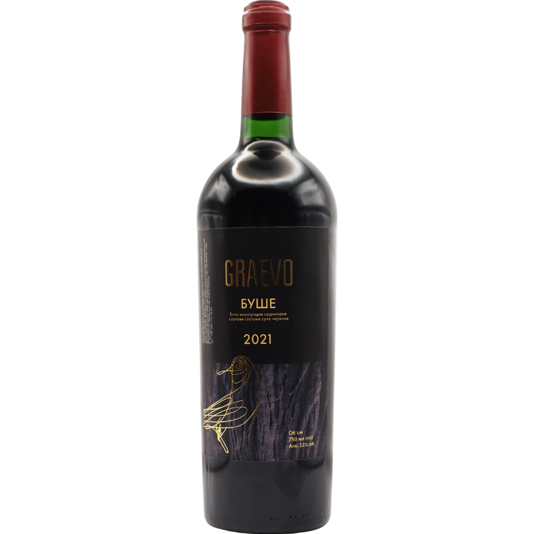 Red, dry wine "Bouche" from craft winery "Grayevo" from Zaporizhzhia. Made from Odessa Black grapes. The wine has a rich dark ruby color. The aroma contains notes of black currant and cherry. The taste is full and harmonious with cherry notes and a long currant aftertaste. This 2021 blend won a Decanter World Wine Awards Bronze Award in 2023.