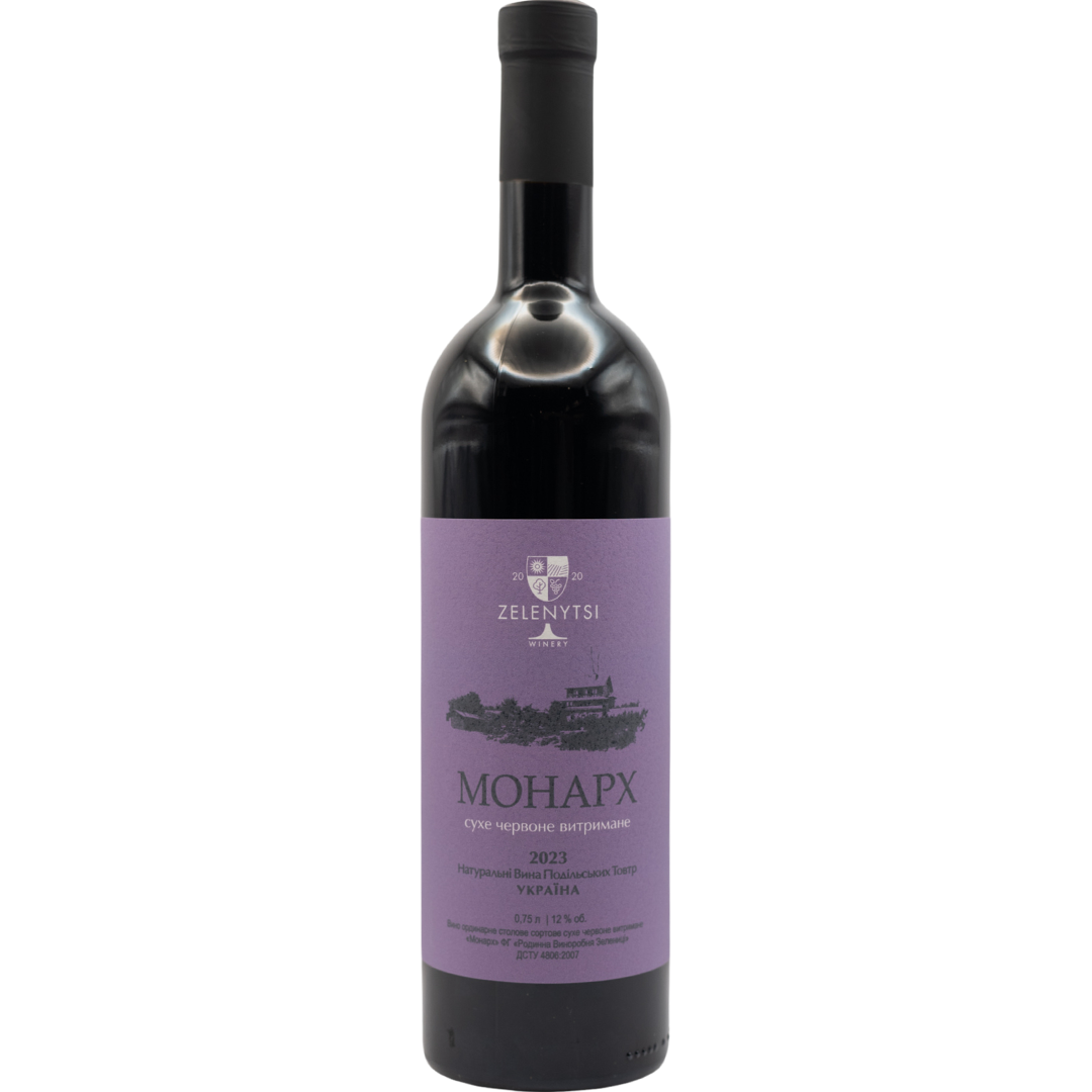 "Monarch" from the Zelenytsi family winery from the Khmelnytskyi region is a dry red wine made from the Monarch grape variety. The aroma of the wine is rich, with fruity notes and tones of aging. The taste is harmonious, well balanced with rich tannins.