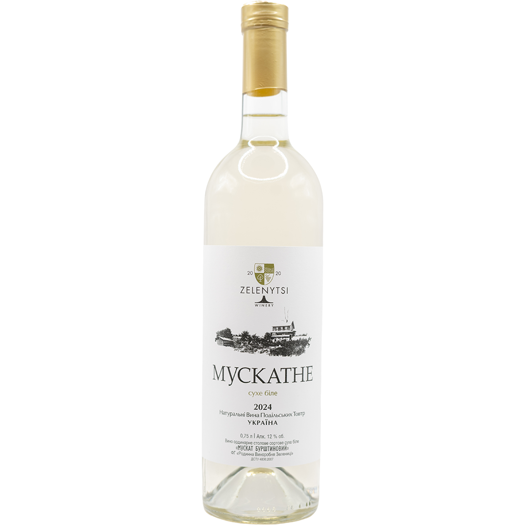 White, dry wine "Muscatne" from the craft winery from Podillia "Zelenytsia". Wine from the Muscat white grape variety. A wonderful, aromatic, light wine that will be enjoyed with friends.