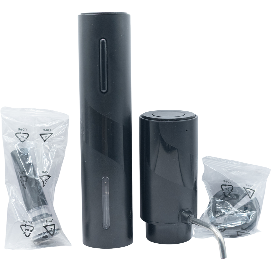 Wine set 4 in 1, which includes electric corkscrew, electric dispenser, vauum cork and knife for foil.