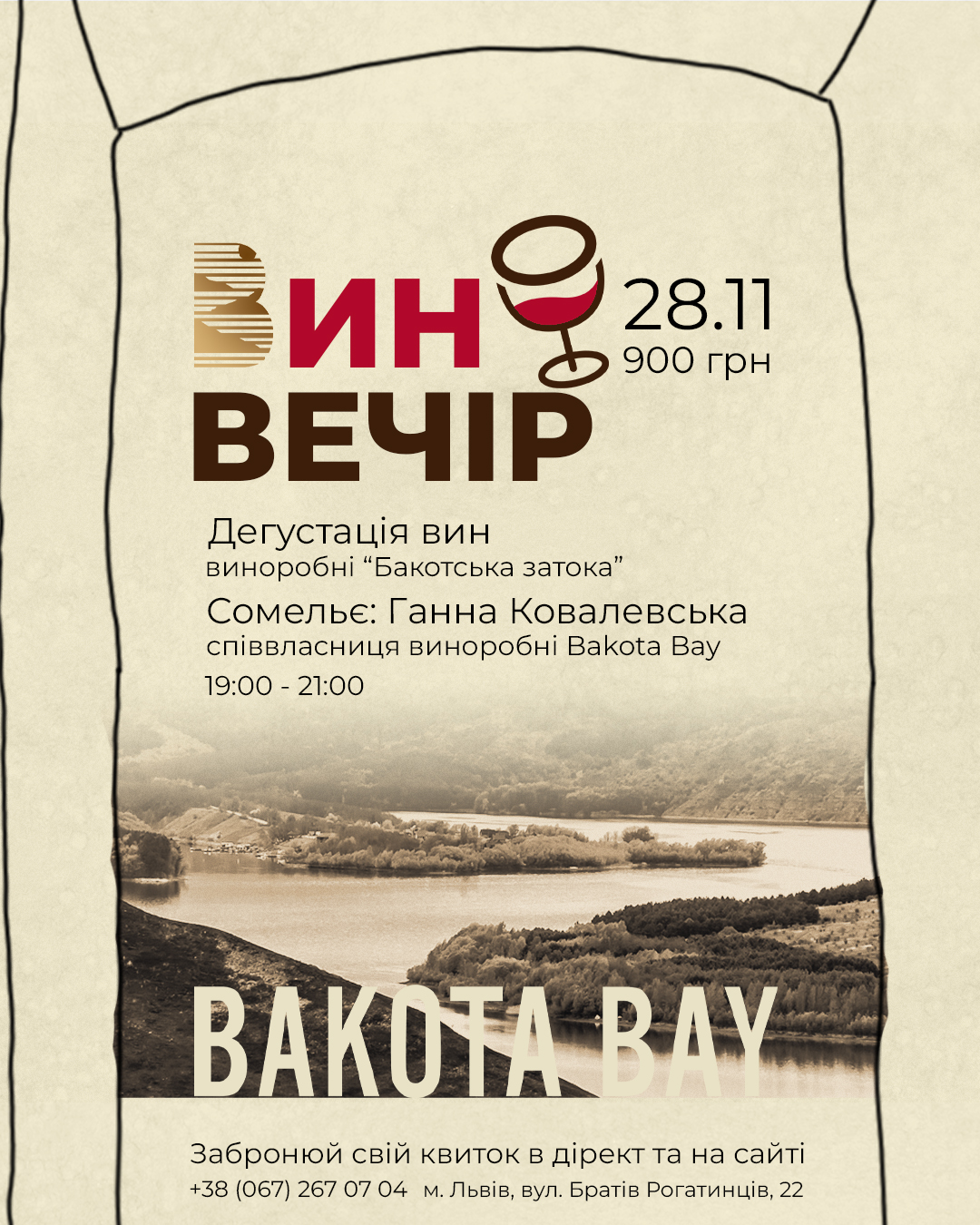 On November 28, in our gastrobar, the co-owner and brand ambassador of Bakota Bay winery and professional sommelier Hanna Kovalevska will hold a tasting of the winery's new products????