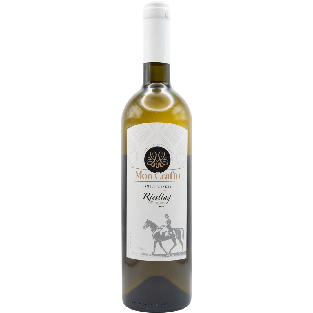 White dry "Riesling" from Mon Crafto is made from the Riesling grape variety. The aroma of the wine is fresh, with notes of green apple, jasmine and nutmeg. The taste is mineralized, with moderate acidity. Best suited to seafood dishes.