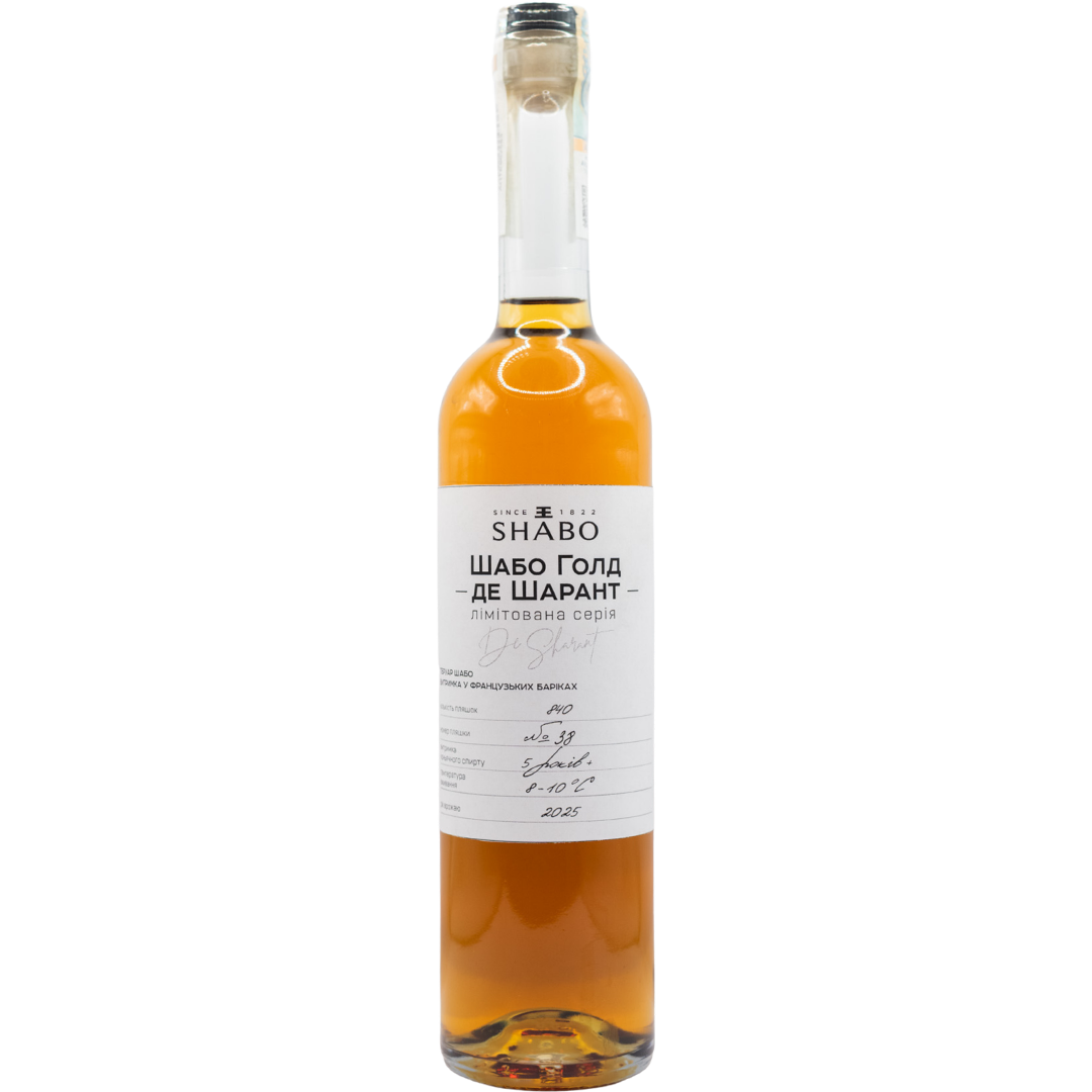 "Голд де Шарант" Шабо - це міцний напій , унікальне поєднання виноградного сусла із сорту Рислінг та коньячних спиртів, витриманих протягом 5 років. Аромат напою насичений нотами айви, груші, абрикосового джему, апельсинових цукатів, жовтої сливи та персика. Смак м'який і округлий з вираженою фруктовою нотою та медовим післясмаком.